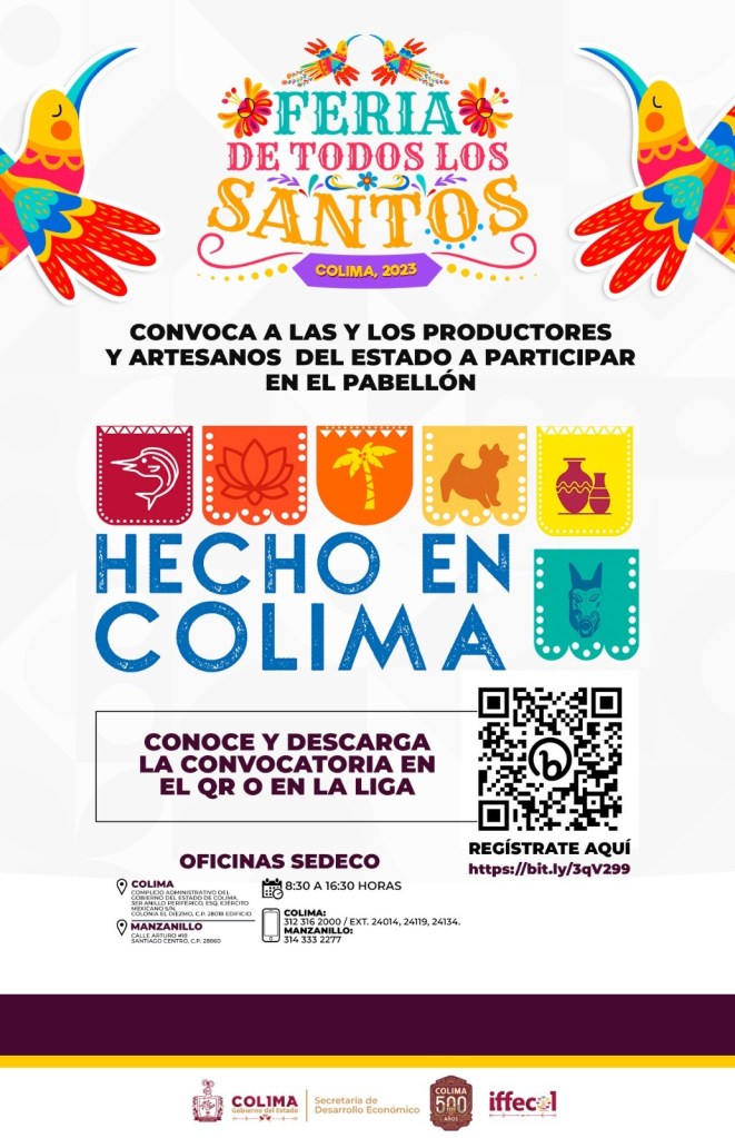 La Secretaría de Desarrollo Económico (Sedeco) del Gobierno del Estado de Colima presentó este lunes la convocatoria para participar en el pabellón ‘Hecho en Colima’ dentro de la Feria de Todos los Santos Colima 2023, que será un espacio de exposición para que artesanas, artesanos y empresas colimenses exhiben y comercializan sus productos, pues se busca impulsar a los sectores productivos de la entidad.