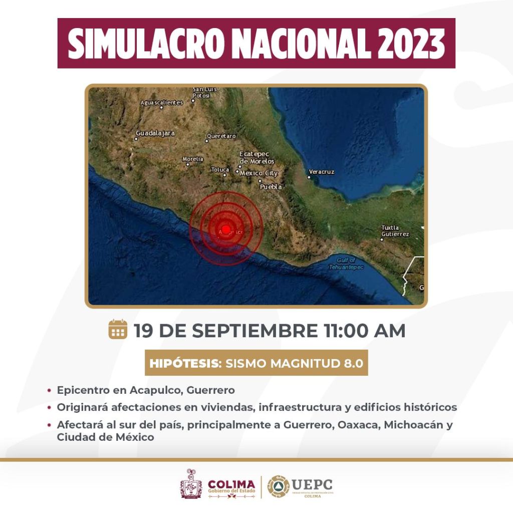En el estado de Colima, la hipótesis seleccionada para llevar a cabo este simulacro se basa en un sismo magnitud 8.0 con epicentro en Acapulco, Guerrero, ocasionando daños en infraestructura, edificios históricos y viviendas.