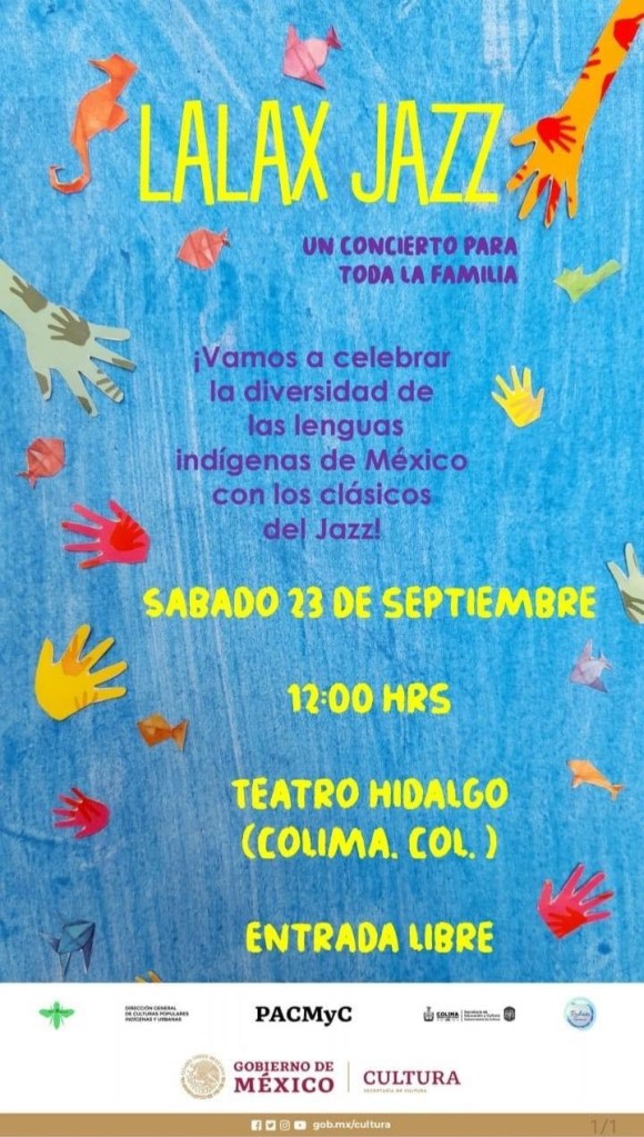 La Secretaría de Cultura del Gobierno de México y la Subsecretaría de Cultura del Gobierno del Estado de Colima invitan a la población colimense a disfrutar el concierto de música en lenguas indígenas mexicanas, titulado ‘Lalax Jazz’, el próximo sábado 23 de septiembre a partir de las 12:00 horas en el Teatro Hidalgo del centro histórico en esta ciudad capital.
