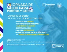 Este jueves 21 de septiembre en la comunidad de La Punta, del municipio de Cosío, se ofrecerán diversos servicios gratuitos para las mascotas, como valoración médica, vacunación antirrábica, desparasitación, vacunas adicionales para cachorros y adultos; además, habrá pláticas de concientización sobre la tenencia responsable de animales.