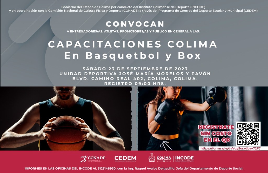 El Instituto Colimense del Deporte (Incode), en coordinación con la Comisión Nacional de Cultura Física y Deporte (Conade), a través del Programa de Centros del Deporte Escolar y Municipal (Cedem), invitan al público en general a participar en las capacitaciones de baloncesto y boxeo, a efectuarse este sábado 23 de septiembre en la Unidad Deportiva ‘José María Morelos y Pavón’.
