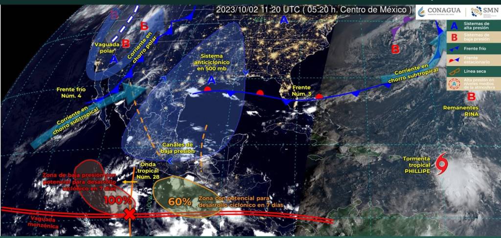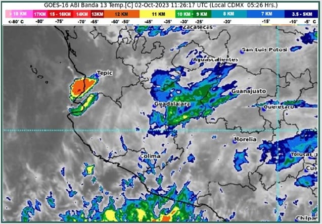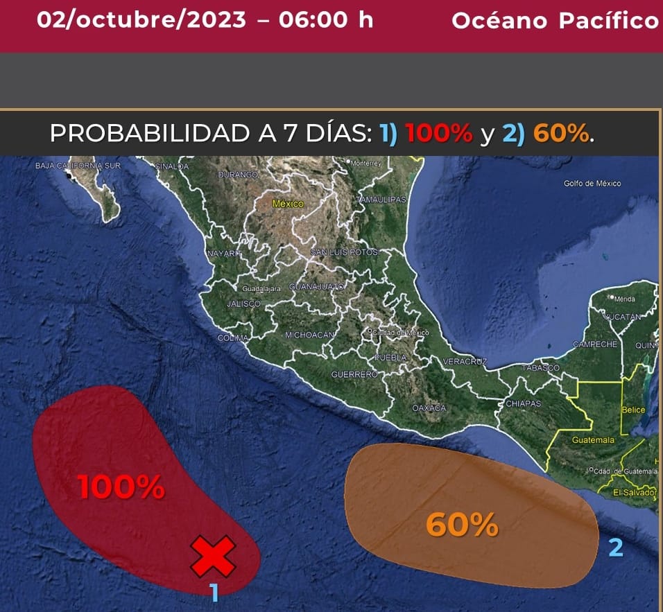 Hoy lunes 2 de octubre, se fortalece una zona de baja presión con probabilidad para desarrollo ciclónico, que se desplazará al sur de las costas de Colima y Michoacán. Asimismo, canales de baja presión se extenderán sobre el occidente, centro y sureste mexicano, ocasionando lluvias puntuales muy fuertes en el occidente y oriente de la República Mexicana, incluido el estado de Colima.