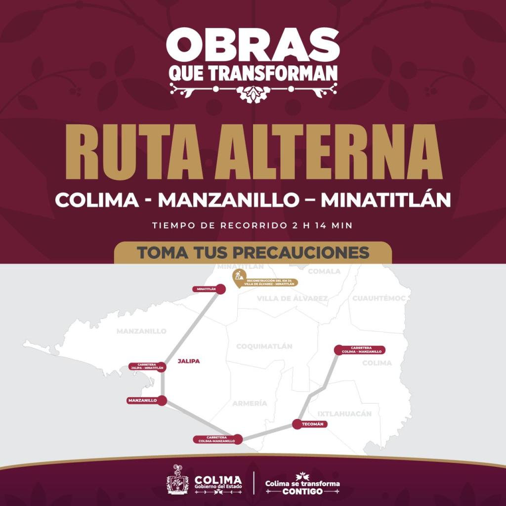 La Secretaría de Infraestructura, Desarrollo Urbano y Movilidad (Seidum) del Gobierno del Estado de Colima recuerda a la población que necesita trasladarse al municipio de Minatitlán, que también lo puede hacer utilizando la vía alterna por la carretera Manzanillo-Minatitlán, aunque por la carretera entre Villa de Álvarez y Minatitlán siguen funcionando las ‘ventanas de paso’ en los horarios establecidos.