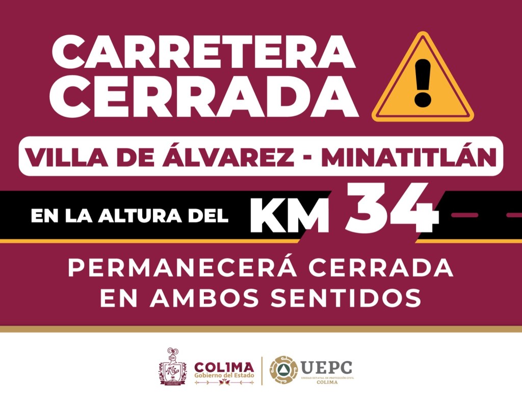El Gobierno del Estado de Colima, a través de la Unidad Estatal de Protección Civil (UEPC), en coordinación con la Secretaría de Infraestructura, Desarrollo Urbano y Movilidad (Seidum), informa que, durante las próximas 48 horas, la carretera Villa de Álvarez-Minatitlán, a la altura del kilómetro 34, permanecerá cerrada en ambos sentidos.