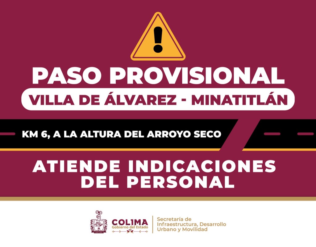 La Secretaría de Infraestructura, Desarrollo Urbano y Movilidad (Seidum) del Gobierno del Estado de Colima informa que este miércoles ya quedó habilitado un paso provisional en el kilómetro 6 de la carretera que comunica los municipios de Villa de Álvarez y Minatitlán.