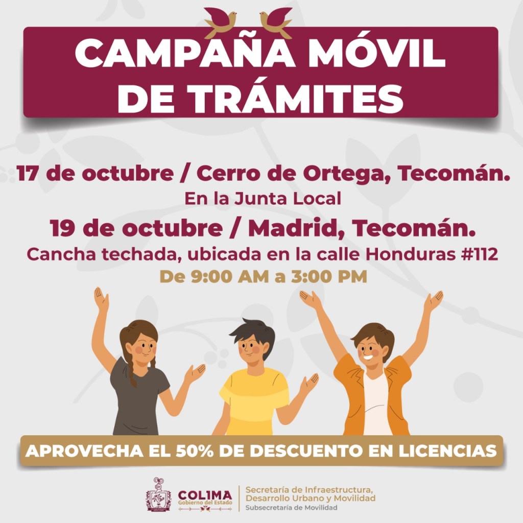 El Gobierno del Estado de Colima, a través de la Subsecretaría de Movilidad (Subsemov), llevará a cabo la campaña móvil de descuentos en licencias de conducir a comunidades rurales de Tecomán, para facilitar el acceso a este documento oficial.