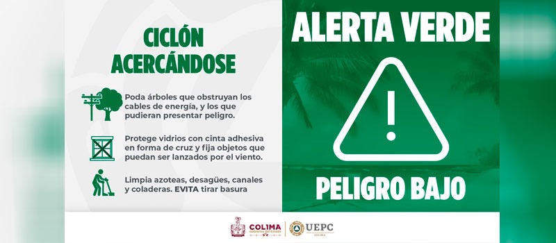 La Coordinación Nacional de Protección Civil (CNPC) del Gobierno de México ha emitido alerta verde para el norte, oeste, centro y sur del estado de Colima, lo cual, refiere peligro bajo para nuestra entidad y debe informarse a la población de su evolución y posibles afectaciones; por tal razón, la Unidad Estatal de Protección Civil (UEPC) del Gobierno del Estado de Colima está al pendiente de la evolución de este fenómeno hidrometeorológico.