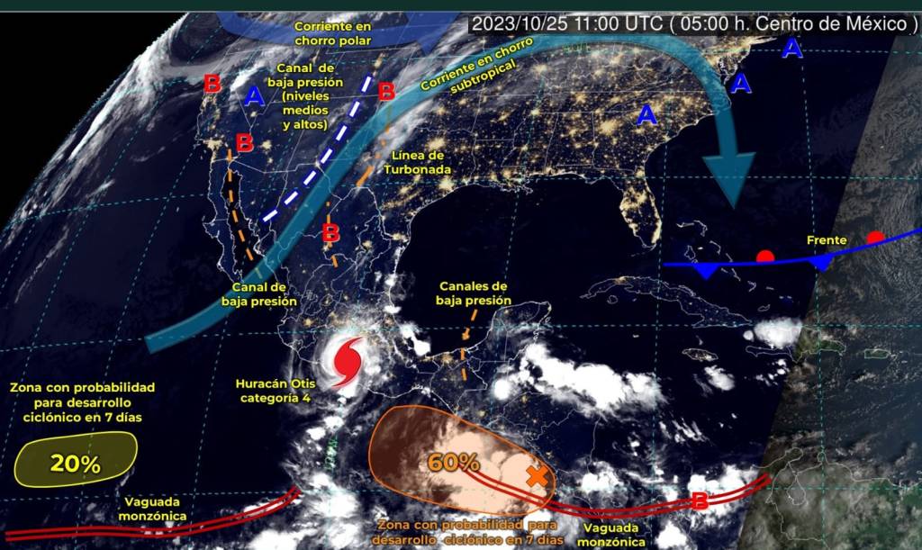 Hoy miércoles 25 de octubre, el huracán ‘Otis’ se ha debilitado a categoría 2 en la escala Saffir-Simpson; sin embargo, ocasionará lluvias puntuales muy fuertes a intensas en el sur del país, con puntuales extraordinarias (acumulados superiores a 250 milímetros en 24 horas), rachas intensas de viento y oleaje elevado en Guerrero.