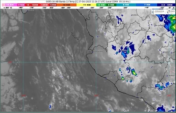El Servicio Meteorológico Nacional (SMN) informa en su reporte de este viernes 27 de octubre, que se prevén chubascos de 5 a 25 milímetros en Colima, Jalisco, Michoacán, Ciudad de México, Estado de México, Morelos, Campeche, Quintana Roo, Tabasco y Tlaxcala, así como lluvias de diferentes intensidades en otros estados del país, ocasionadas por canales de baja presión que se extenderán sobre el occidente, centro, oriente y sureste de México, aunado al ingreso de humedad del Océano Pacífico y Golfo de México e inestabilidad en niveles altos de la atmósfera.