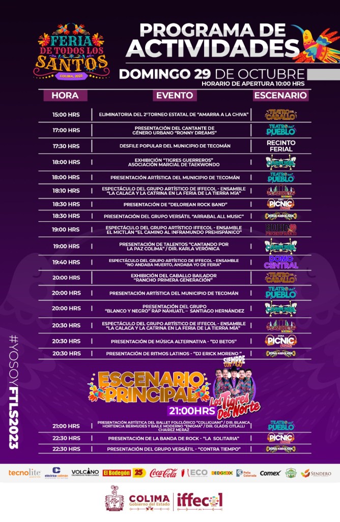 En el programa vespertino este 29 de octubre, a partir de las 15 horas está la eliminatoria del segundo torneo estatal “Amarra a la chiva” que se realiza en el Teatro del Caballo; a las 17 horas inicia la presentación del cantante de género urbano Ronny Dreams en el Teatro del Pueblo, mientras que a las 17:30 horas está programado el desfile popular del municipio de Tecomán en el recinto ferial.