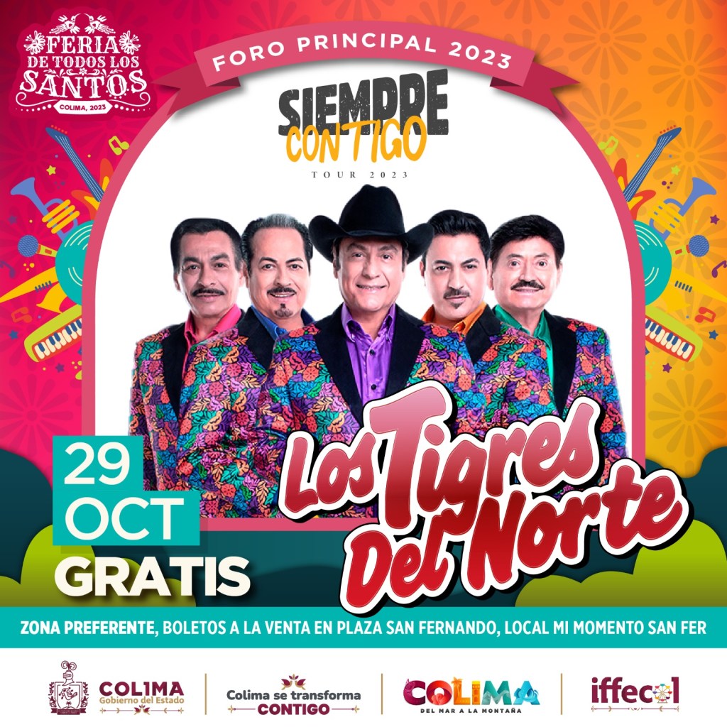 Hoy domingo 29 de octubre, las familias colimenses y de lugares circunvecinos, podrán disfrutar del segundo concierto gratuito en el Foro Principal de la Feria de todos los Santos Colima 2023, con la presentación estelar de Los Tigres del Norte, que amenizarán sus grandes éxitos y harán vibrar el escenario del recinto ferial.