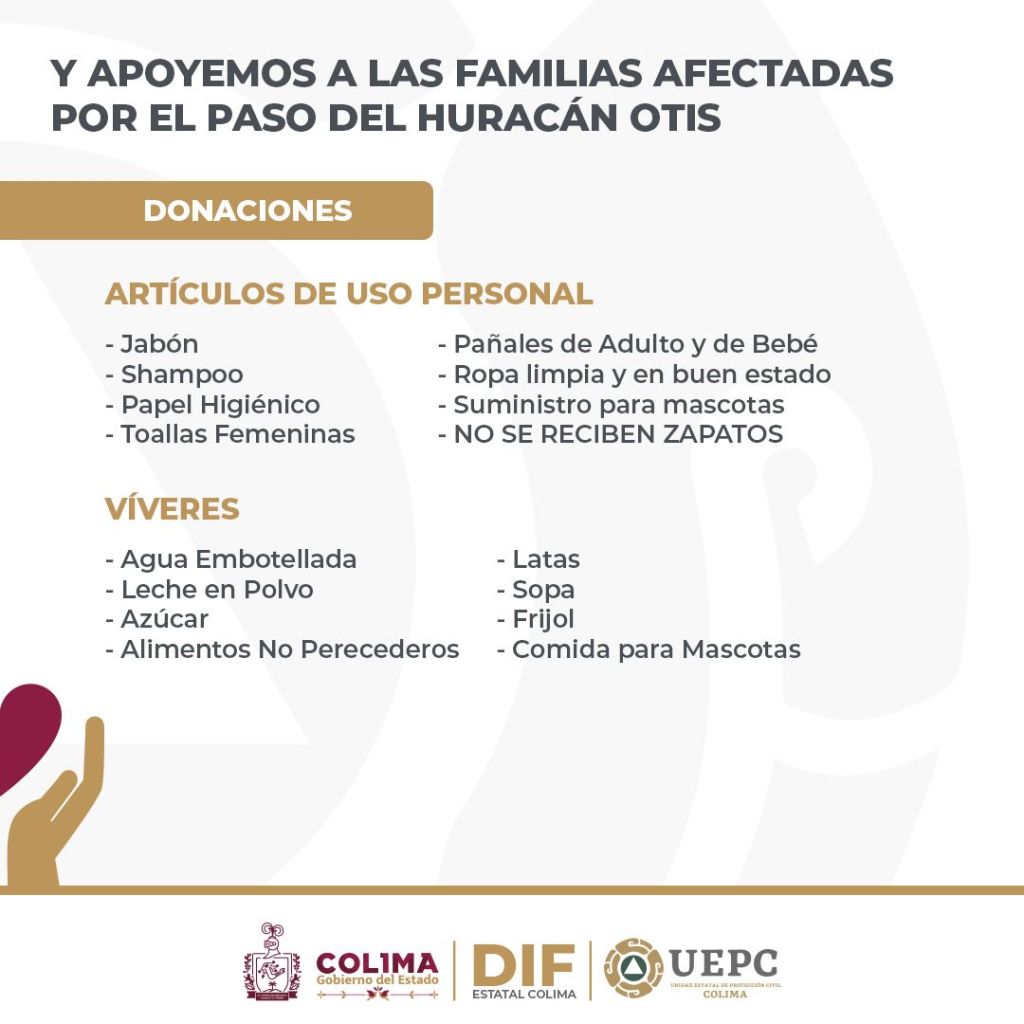 El Voluntariado de la Subsecretaría de las Juventudes (Subsejuv) del Gobierno del Estado de Colima hizo un llamado a toda la población para apoyar a las familias del hermano estado de Guerrero, que resultaron afectadas por el huracán ‘Otis’ de categoría 5 -máximo nivel de la escala Saffir-Simpson-, el pasado 24 de octubre, donando en los centros de acopio que coordina el DIF Estatal Colima, para recolectar víveres y artículos de uso personal que se enviarán a esa entidad.