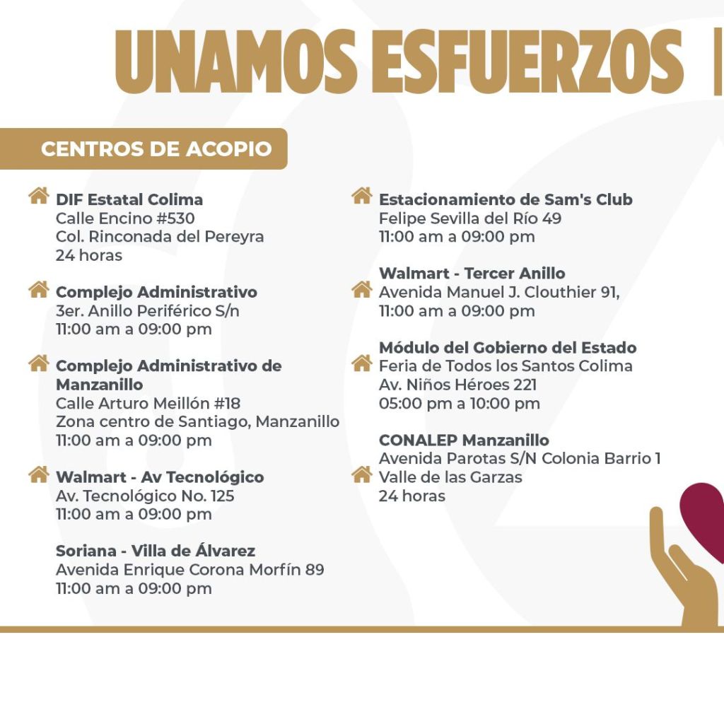 Los horarios de recaudación de artículos y víveres serán de 9:00 am a 9:00 pm en el cetro de acopio de Sam´s Club Colima desde el 27 de octubre, mientras que en Walmart Tecnológico los horarios serán de 9:00 am a 3:00 pm los días 28 y 29 de octubre y en Soriana Híper de Villa de Álvarez se mantendrá el horario de 9 :00 am a 3:00 pm los días 28 y 29 de octubre.