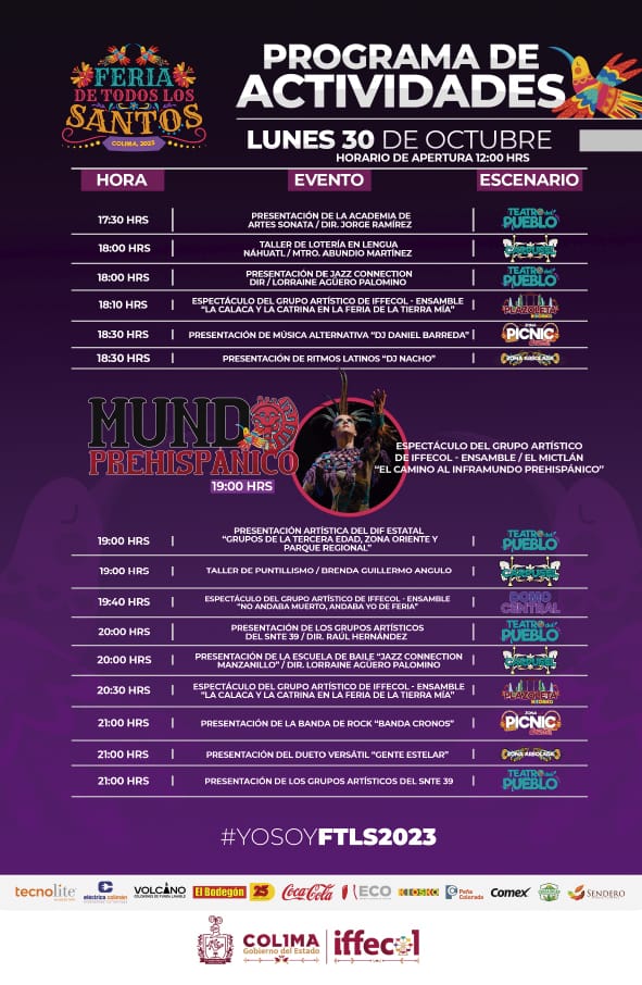 En la Plazoleta a las 18:10 horas se tendrá el espectáculo “La Calaca y la Catrina en la Feria de la Tierra Mía” que ofrece el grupo artístico del Iffecol-Ensamble, mientras que a las 18:30 horas se presentarán dos atractivos eventos musicales: Ritmos Latinos DJ Nacho en Zona Arbolada y Música Alternativa con el DJ Daniel Barreda en la Zona Picnic, mientras que a las 19:00 horas el performance “El camino a inframundo prehispánico, por el grupo artístico del Iffecol y Ensamble El Mictlán, en Mundo Prehispánico.