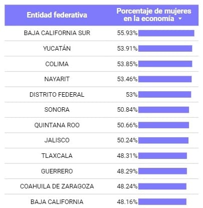 La información generada del más reciente trimestre muestra una importante participación de mujeres en la economía estatal, desempeñándose principalmente en el sector de servicios. El estudio evalúa las 32 entidades de México, donde Baja California Sur es la entidad con mayor participación de las mujeres con 55.93%, Yucatán con 53.91 % y Colima con 53.85%. En contraparte, el estado que refleja menor participación de mujeres en la actividad económica es Chiapas con 33.89%.