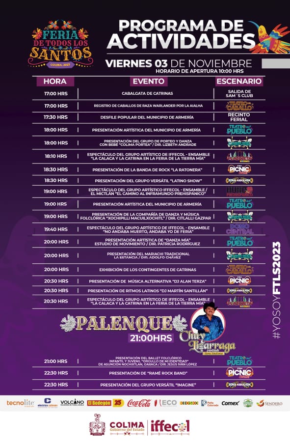 En el octavo día de la edición 84 en la Feria de Todos los Santos Colima 2023, el programa de actividades para hoy viernes ofrece a las y los visitantes diversos eventos variados para todos los gustos.
