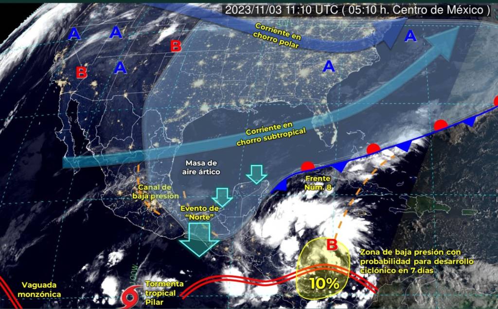 Hoy viernes 3 de noviembre, el frente frío número 8 permanecerá estacionario sobre el occidente del Mar Caribe, interaccionará con una baja presión con probabilidad para desarrollo ciclónico, produciendo lluvias puntuales muy fuertes en la Península de Yucatán, con puntuales intensas en Quintana Roo.