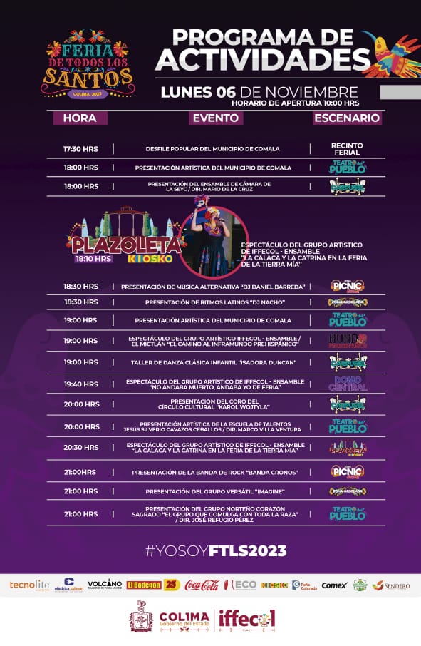 Con el desfile popular a partir de las 17:30 horas en el recinto ferial y la presentación artística a las en el Teatro del Pueblo a las 18:00 y 19:00 horas, hoy lunes inicia la segunda semana en la Feria de Todos los Santos Colima 2023, que ofrece una variada opción de eventos gratuitos y diversas actividades para todos los gustos, en lo que será el undécimo día del máximo festejo anual.