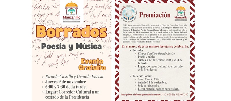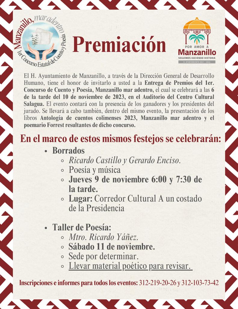 Aunque está por definirse la sede, el sábado 11 de noviembre de 2023, también se realizará un taller de poesía, mismo que será impartido por el maestro Ricardo Yáñez. Para más información puede comunicarse a los teléfonos: 312 219 20 26 y 312 103 73 42.