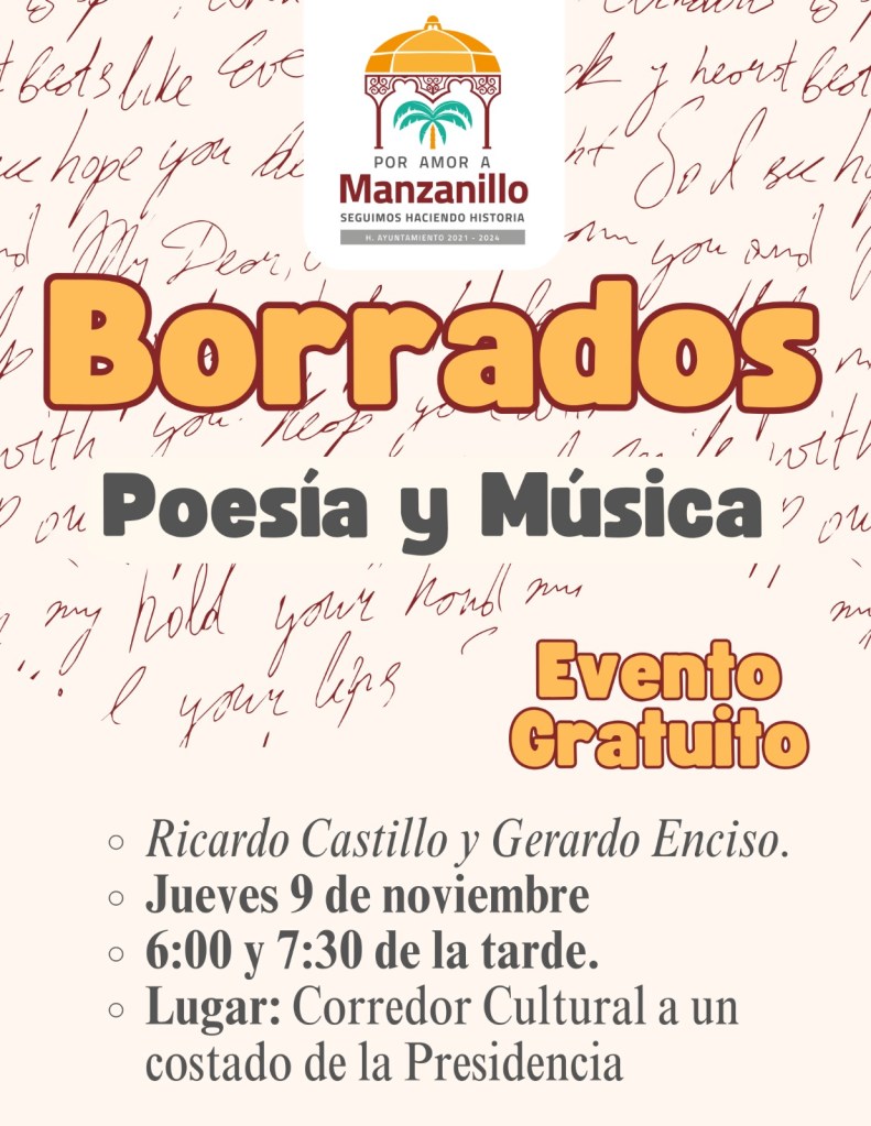 Asimismo, en el marco de estos festejos, pero el jueves 09 de noviembre de 2023 a las 6 de la tarde, se desarrollará el evento “Borrados” de poesía y música en el corredor cultural, que se ubica a un costado del edificio de la presidencia municipal; ahí Ricardo Castillo y Gerardo Enciso darán una muestra de esas artes.