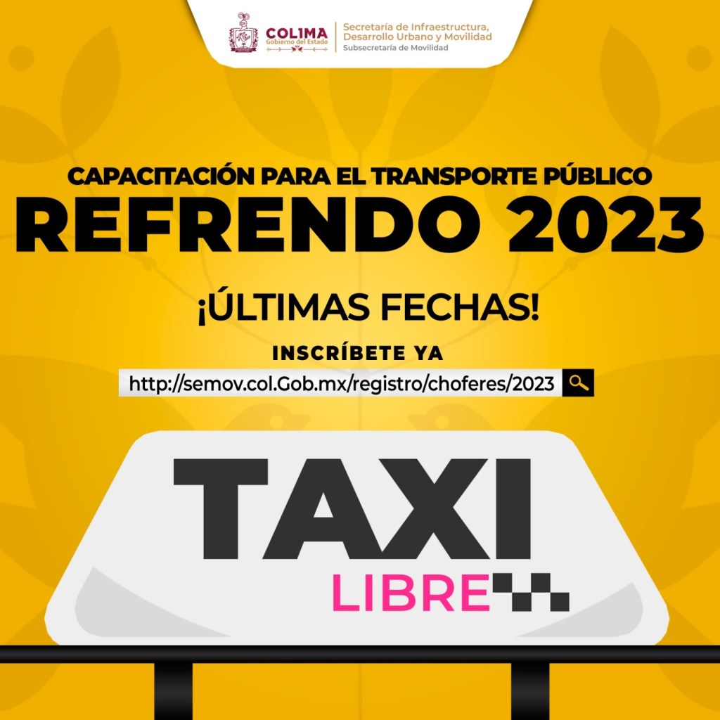 El Gobierno del Estado de Colima, a través de la Subsecretaría de Movilidad (Subsemov), hace un llamado urgente a todas las personas conductoras de transporte público individual y colectivo para realizar la última capacitación del presente año 2023; este refrendo es un trámite obligatorio para todas y todos los conductores, y es crucial para garantizar la seguridad y calidad del servicio.