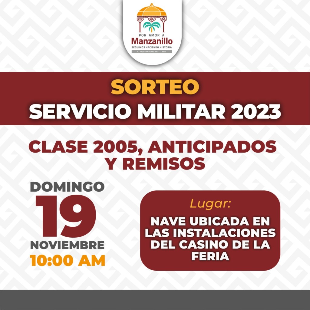 Como cada año, el Ayuntamiento de Manzanillo, que preside Griselda Martínez, realizará el Sorteo Anual del Servicio Militar Nacional clase 2005 y remisos, este evento se llevará a cabo, a las 10 de la mañana de este domingo 19 de noviembre de 2023, en las instalaciones del Casino de la Feria de Manzanillo, ubicado en la avenida Elías Zamora Verduzco No. 2199 en Salagua.