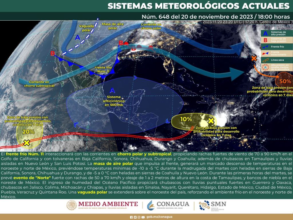 Durante las próximas horas, el ingreso de humedad del Océano Pacífico propiciará chubascos con lluvias puntuales fuertes en Guerrero y Oaxaca, chubascos en Jalisco, Colima, Michoacán y Chiapas, y lluvias aisladas en Sinaloa, Nayarit, Querétaro, Hidalgo, Estado de México, Ciudad de México, Puebla, Veracruz y Quintana Roo.