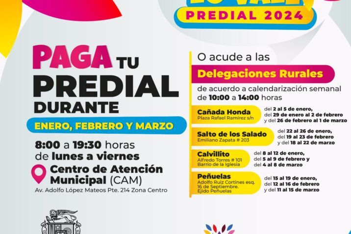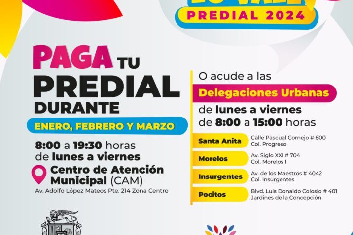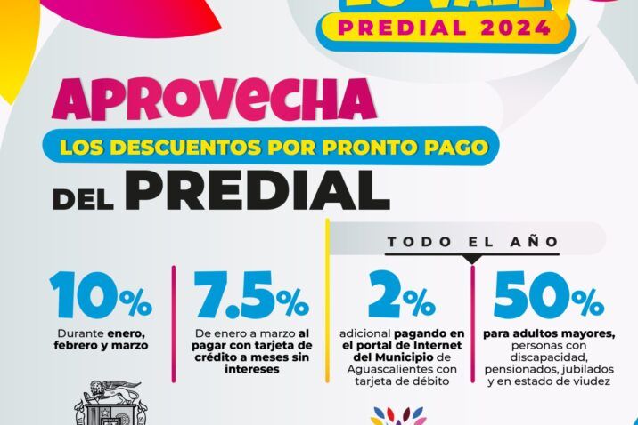 El Municipio de Aguascalientes arrancará este lunes 1 de enero con la campaña de predial 2024 “Aguascalientes lo Vale”. Se agradece de antemano a las personas que de manera responsable cumplen con su pago puntual, recursos que se destinarán eficientemente a la mejora de los servicios públicos y a la generación de más obras de infraestructura en beneficio de las familias.