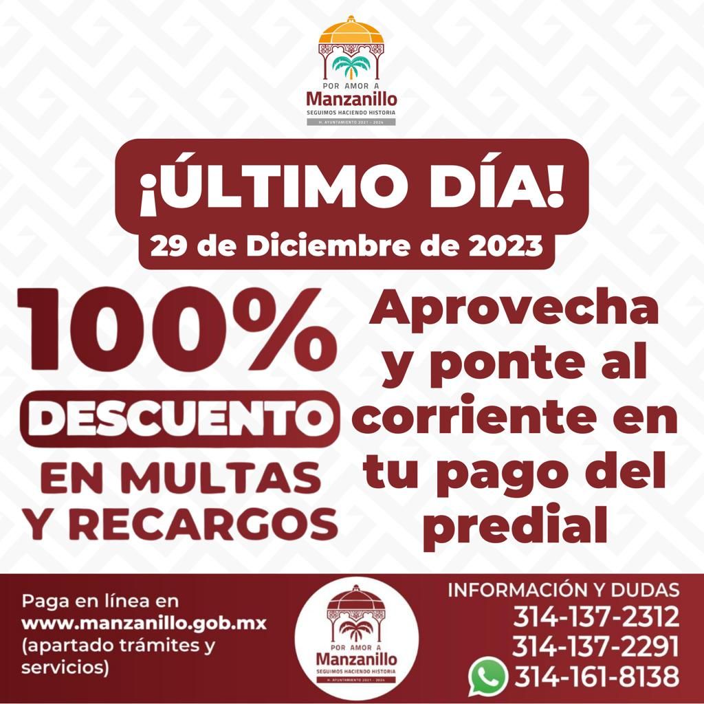 En apoyo de la economía familiar, por instrucciones de la presidenta Griselda Martínez, el Ayuntamiento de Manzanillo ofrece sólo este jueves y viernes 28 y 29 de diciembre de 2023, descuentos del 100 por ciento en multas y recargos del impuesto predial.