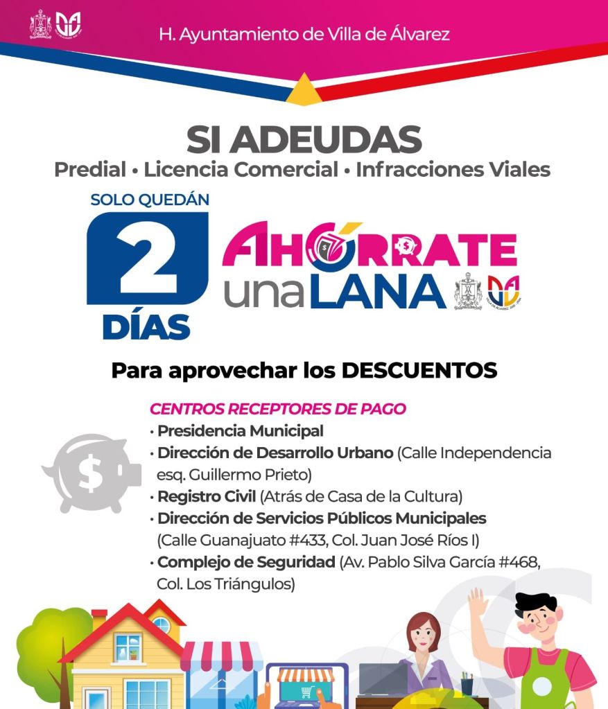 A iniciativa del Ayuntamiento de Villa de Álvarez, el Municipio no cobra la totalidad de multas y recargos generados por adeudos del año 2022 y anteriores en impuesto predial, siempre que se pongan al corriente y liquiden todo el año 2023.