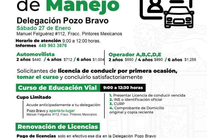 El Municipio de Aguascalientes, a través de la Coordinación General de Delegaciones Urbanas y Rurales invita a la ciudadanía a renovar la licencia de manejo para automovilista y operador tipo A, B, C, D y E este próximo sábado 27 de enero en la Delegación Pozo Bravo, en un horario de las 9:00 a las 12:00 horas.