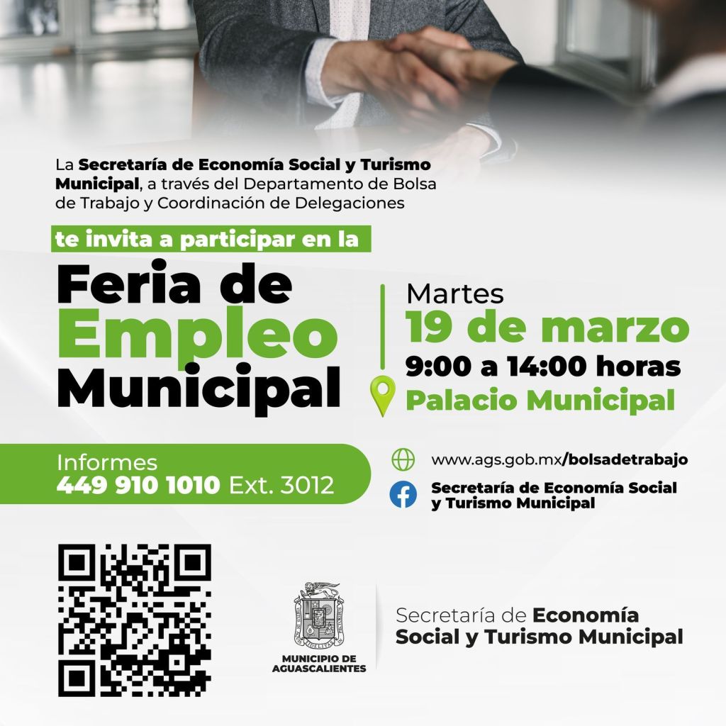 La Secretaría de Economía Social y Turismo Municipal (Setum) invita a la Feria del Empleo Municipal, que se llevará a cabo este martes 19 de marzo, en los Patios de Palacio Municipal, de 9:00 a 14:00 horas, en donde se solicita que los buscadores de empleo acudan con su identificación oficial y solicitud o currículum.