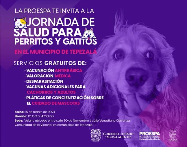 La Procuraduría Estatal de Protección al Ambiente (Proespa) invita a los propietarios de mascotas a la próxima Jornada de Salud para Perritos y Gatitos que se llevará a cabo este viernes 15 de marzo en la comunidad La Victoria, en el municipio de Tepezalá.
