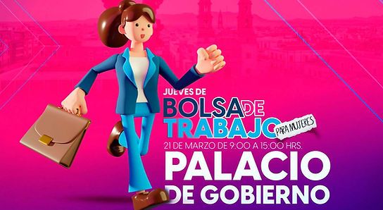 El Servicio Estatal y Nacional de Empleo Aguascalientes (SNEA) informó que el próximo “Jueves de Bolsa de Trabajo” estará enfocado a las mujeres; la cita es este 21 de marzo en los patios del Palacio de Gobierno, de las 9:00 de la mañana a las 3:00 de la tarde, donde se ofrecerán más de 1,000 oportunidades laborales.