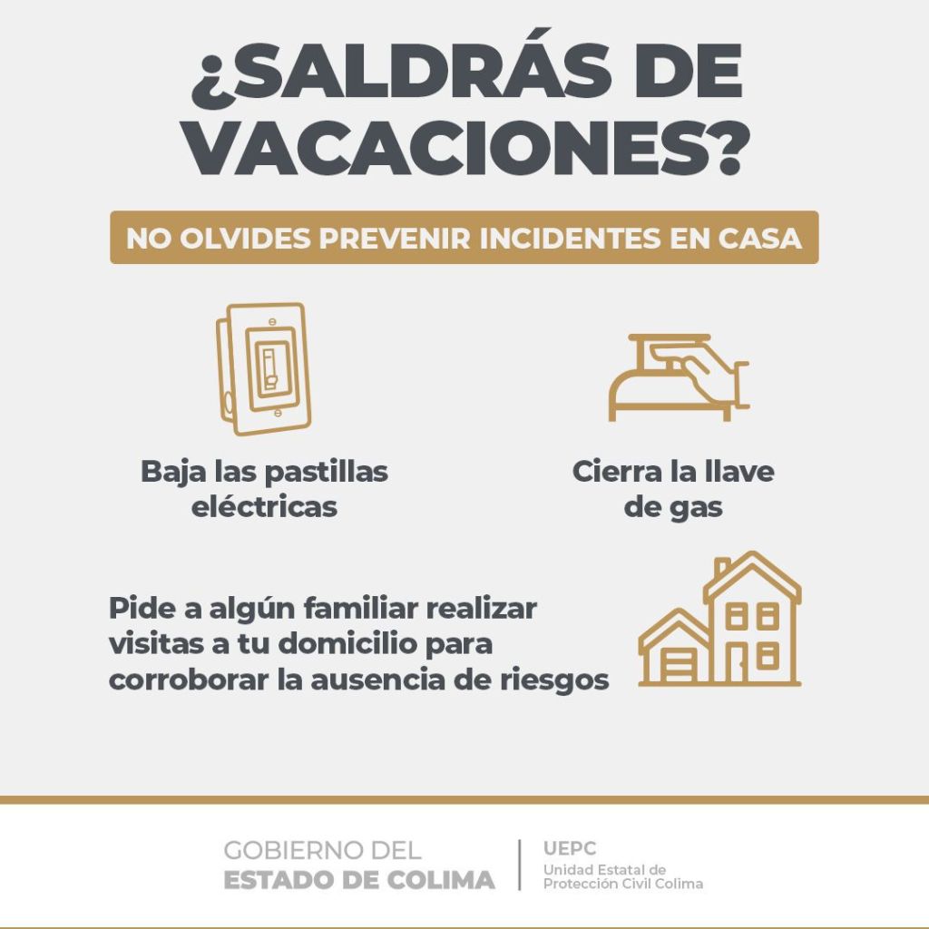 La Unidad Estatal de Protección Civil exhorta a las y los colimenses que saldrán de sus hogares para vacacionar, a tomar las siguientes medidas de seguridad: bajar las pastillas eléctricas, cerrar las llaves de gas y pedir a algún familiar cercano realizar visitas periódicas a sus domicilios, para corroborar la ausencia de riesgos.