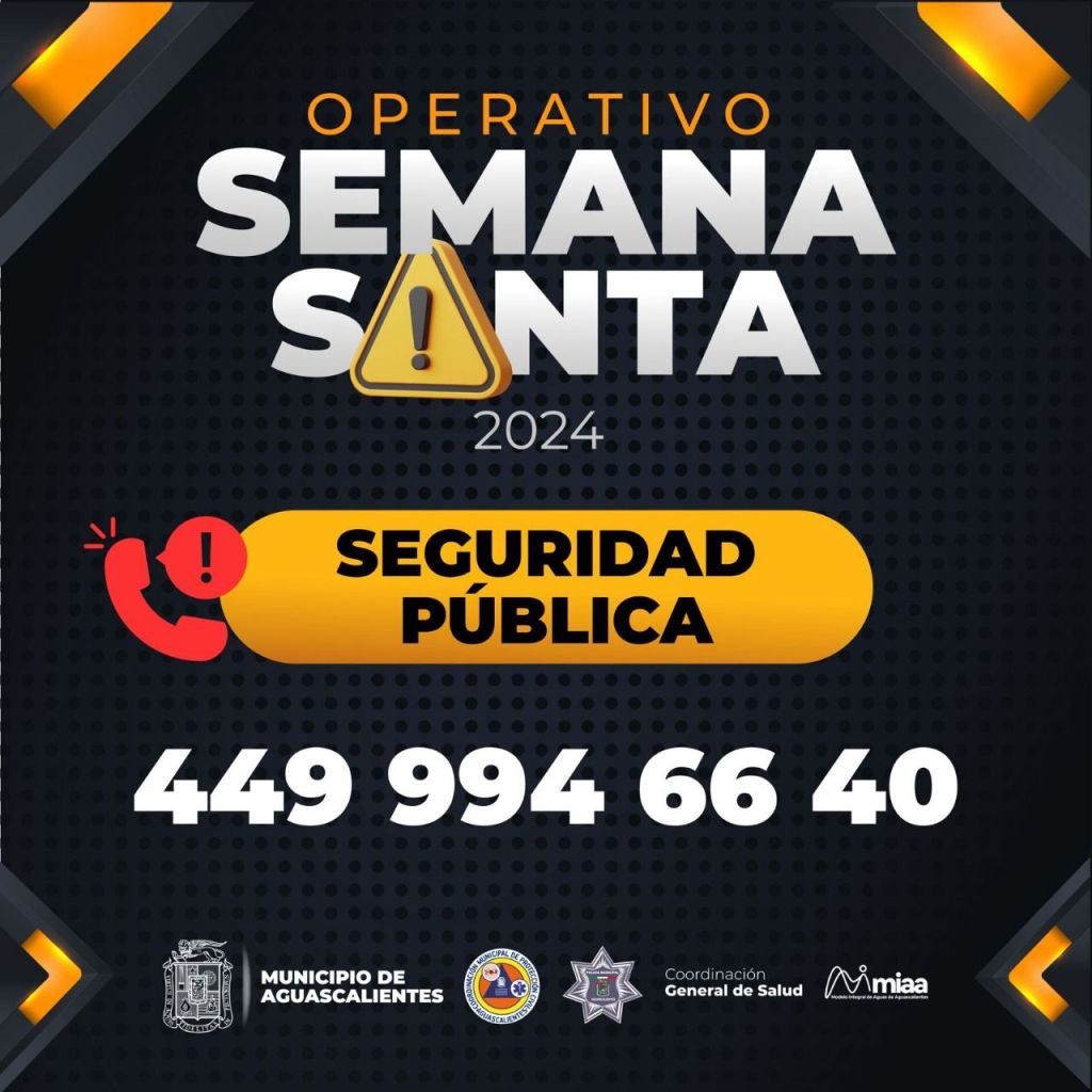 Con motivo de la Semana Santa 2024, la Secretaría de Seguridad Pública Municipal de Aguascalientes (SSPM), llevará a cabo un operativo de vigilancia y prevención especial, a partir del jueves 28 de marzo y hasta la madrugada del lunes 1 de abril, con especial atención y estrecha vigilancia en zonas de esparcimiento, así como en bordos, presas, áreas naturales y balnearios, principalmente, en el que participarán de manera coordinada diferentes cuerpos de emergencia.