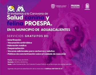 El Gobierno del Estado, a través de la Procuraduría Estatal de Protección al Ambiente (Proespa), invita a las y los propietarios de mascotas a participar en las Caravanas de la Salud Canina y Felina que se realizarán en los municipios de Aguascalientes y Rincón de Romos.