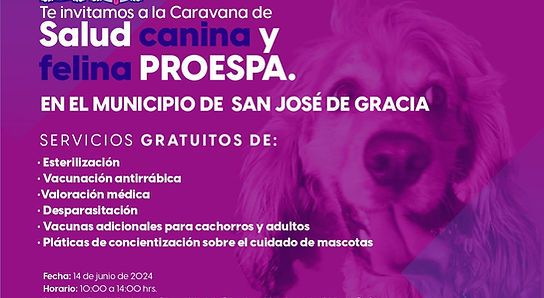 La Procuraduría Estatal de Protección al Ambiente (Proespa) invita a las y los propietarios de mascotas a participar en la Caravana de la Salud Canina y Felina que se llevará a cabo este viernes 14 de junio en la comunidad de Paredes, en el municipio de San José de Gracia.