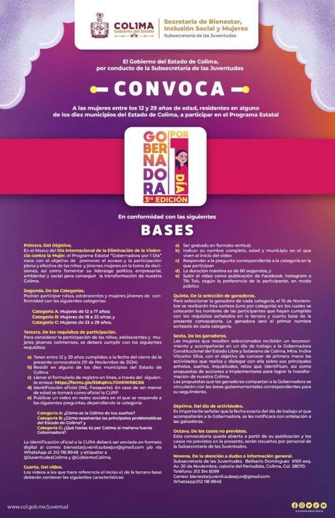 La Subsecretaría de las Juventudes (Subsejuv) del Gobierno del Estado de Colima reiteró la invitación a niñas y mujeres de 12 a 29 años de edad, para participar en la tercera edición de ‘Gobernadora por un día’, como parte de las actividades para conmemorar el Día Internacional de la Eliminación de la Violencia contra la Mujer.