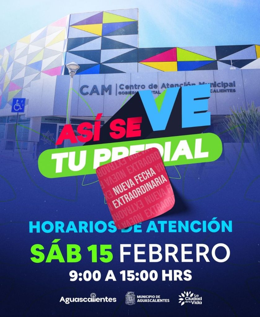 La titular de la Secretaría de Finanzas del Municipio de Aguascalientes, Miriam Rodríguez Tiscareño, dio a conocer que este sábado 15 de febrero el Centro de Atención Municipal (CAM), abrirá sus puertas de 9:00 a 15:00 horas para recibir pagos de predial.