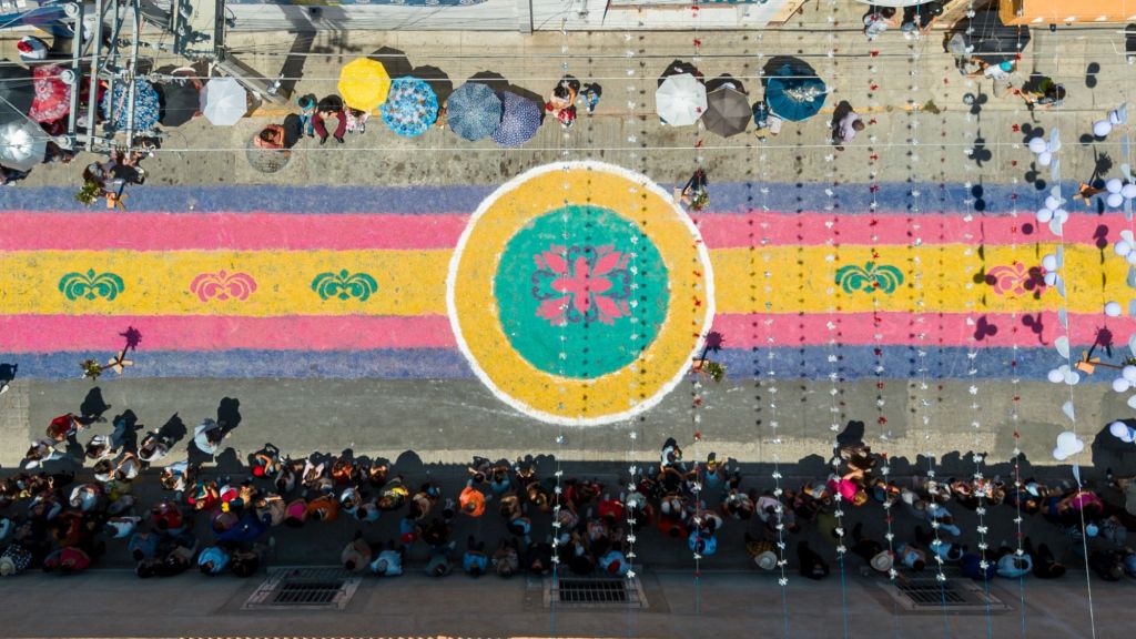 Esta tradición, que tiene más de 50 años de antigüedad, comienza 30 días antes con la preparación y pintado del aserrín, resultado del esfuerzo y dedicación de familias y artesanos que mantienen viva esta expresión de fe y cultura