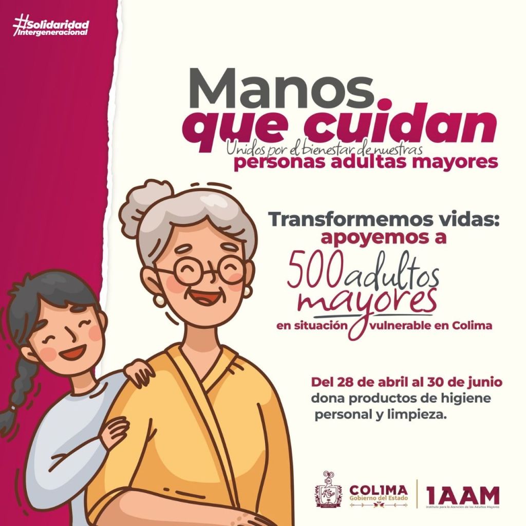 El Gobierno del Estado de Colima, a través del Instituto para la Atención de los Adultos Mayores (IAAM), realiza desde hoy y hasta el 30 de junio la campaña de donación de artículos de limpieza e higiene personal para personas adultas mayores que requieren estos apoyos, actividad que se enlaza con el Día Internacional de la Solidaridad Intergeneracional que se celebra este martes 29 de abril.