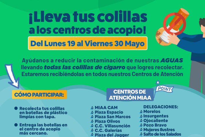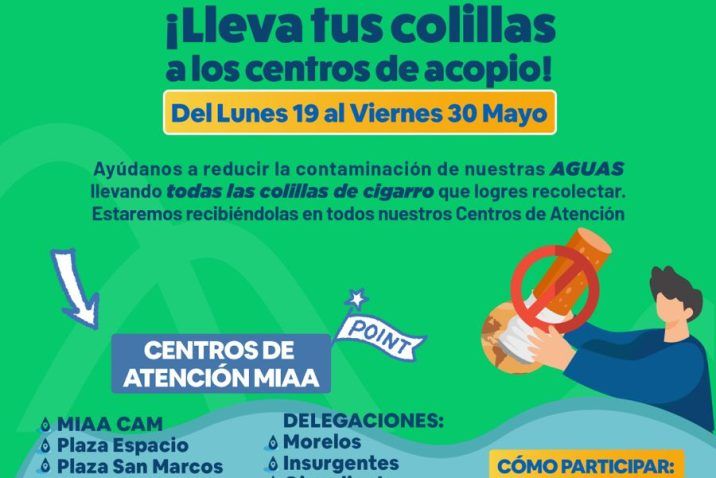 Del 19 al 30 de mayo, el Modelo Integral de Aguas de Aguascalientes (MIAA), llevará a cabo, por segundo año consecutivo, la campaña denominada “Colillatón”, con la que se busca recolectar la mayor cantidad posible de colillas de cigarro, para reducir la contaminación ambiental del agua en el municipio capital.