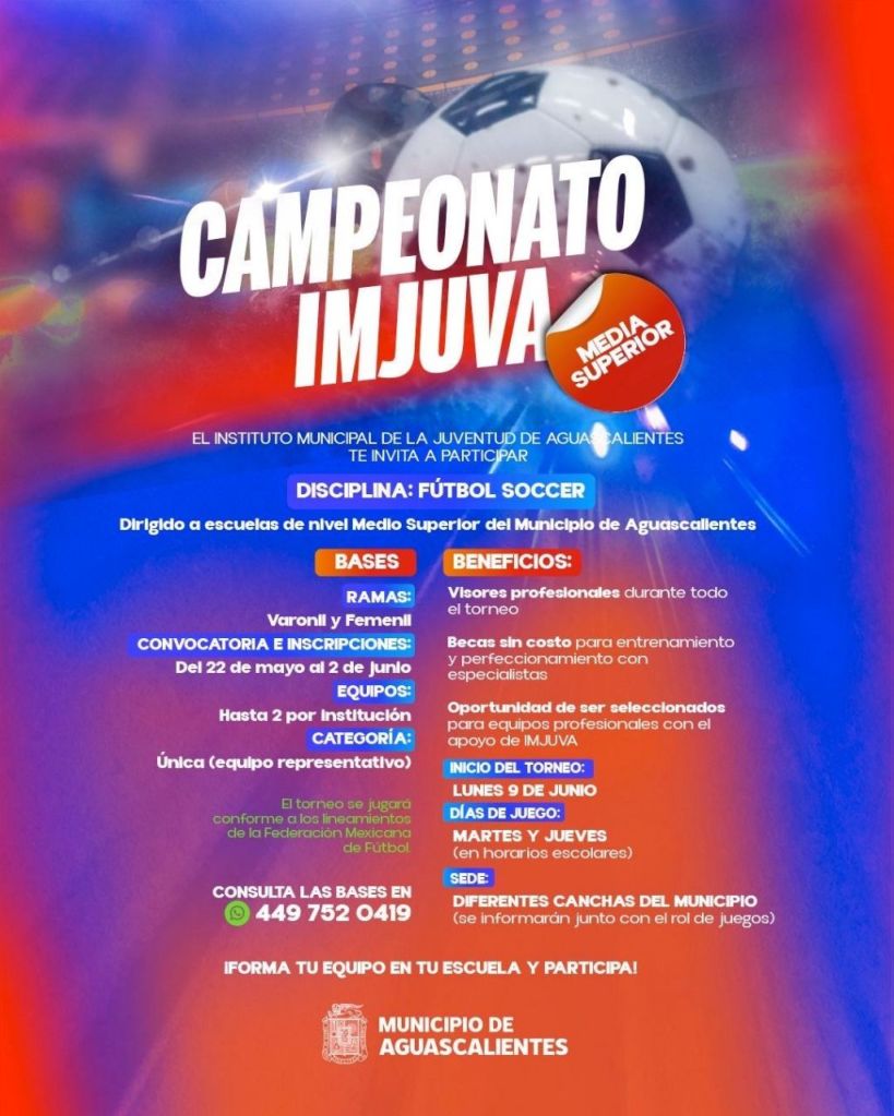 El Municipio de Aguascalientes, a través del Instituto Municipal de la Juventud (Imjuva), invita a las y los jóvenes estudiantes a participar en el Campeonato “IMJUVA Media Superior”, en las disciplinas de básquetbol y fútbol, representando a sus instituciones educativas.