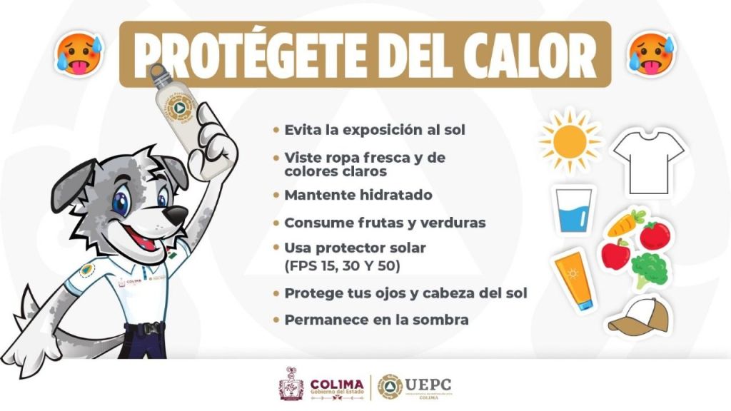 La Unidad Estatal de Protección Civil (UEPC) del Gobierno del Estado de Colima recomienda a la población extremar precauciones, pues de acuerdo al pronóstico del Servicio Meteorológico Nacional (SMN), este jueves en el estado de Colima las temperaturas máximas podrían oscilar entre 40 y 45 grados Celsius, además de que por primera vez en lo que va del año se prevén intervalos de chubascos en algunas zonas de la entidad.
