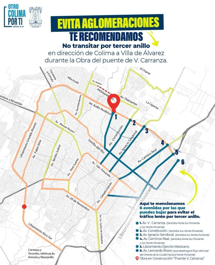 Por tal motivo, se exhorta a la ciudadanía a evitar transitar por el Tercer Anillo en dirección Colima–Villa de Álvarez, y se invita a utilizar las siguientes 6 avenidas alternas, con el objetivo de evitar el encapsulamiento vehicular: