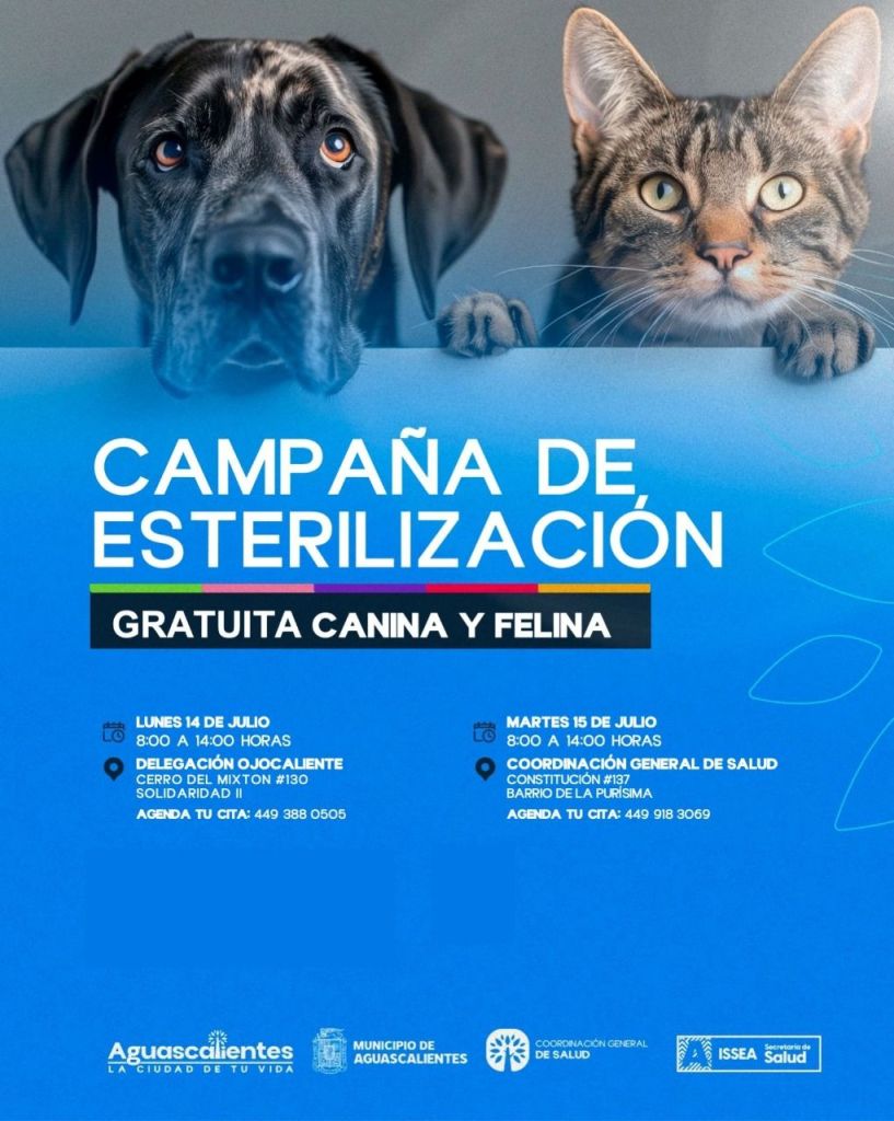 La Secretaría de Servicios de Salud del Estado de Aguascalientes y la Coordinación General de Salud del Municipio de Aguascalientes, anuncian nuevas fechas para esterilizaciones gratuitas para caninos y felinos.