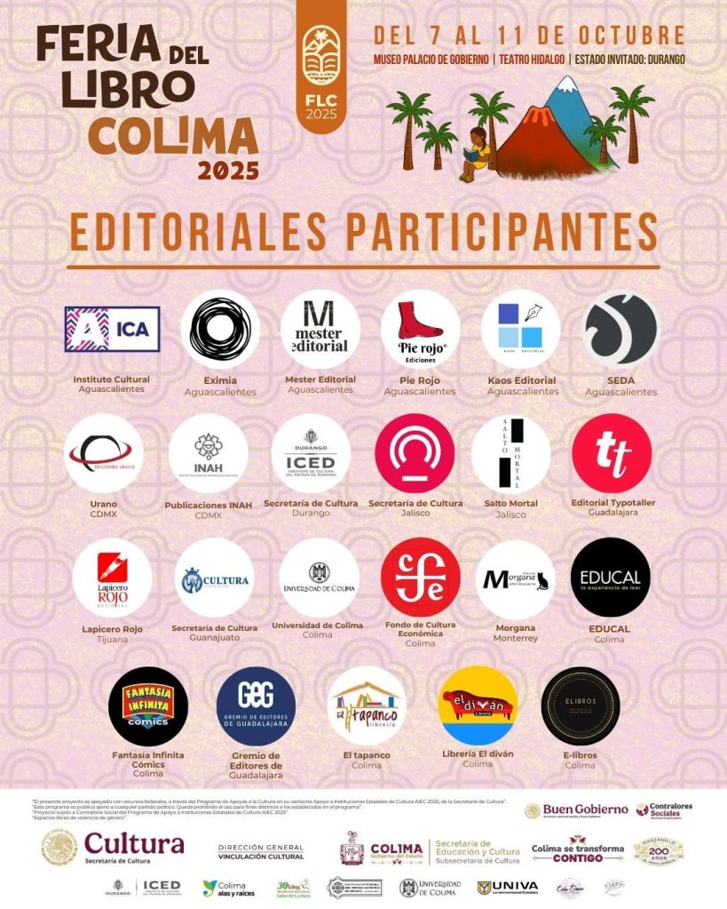 La Feria del Libro Colima 2025, organizada por la Subsecretaría de Cultura del Gobierno del Estado de Colima, en coordinación con la Secretaría de Cultura del Gobierno de México, contará con la participación de 24 editoriales y librerías participantes, provenientes de Nuevo León, Baja California, Guanajuato, Aguascalientes, Michoacán, Jalisco, Ciudad de México y la sede, Colima.