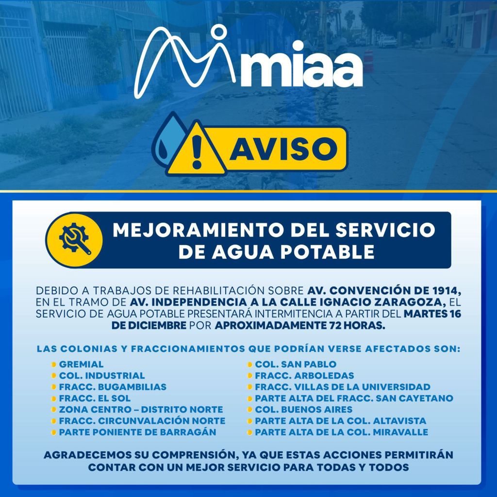 🚧 Debido a trabajos de rehabilitación en la red de agua potable sobre Av. Convención de 1914 norte, el servicio presentará intermitencia por aproximadamente 72 horas en algunas colonias aledañas.