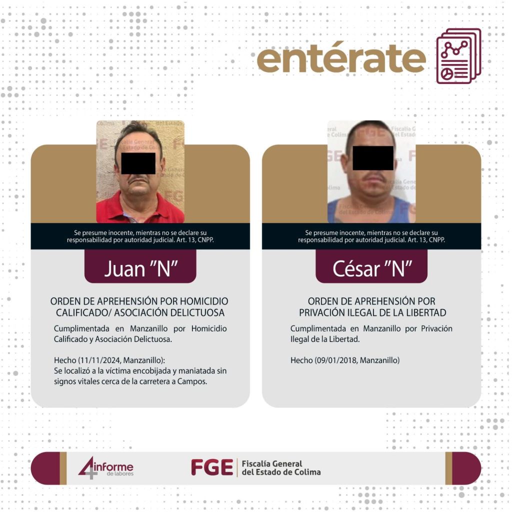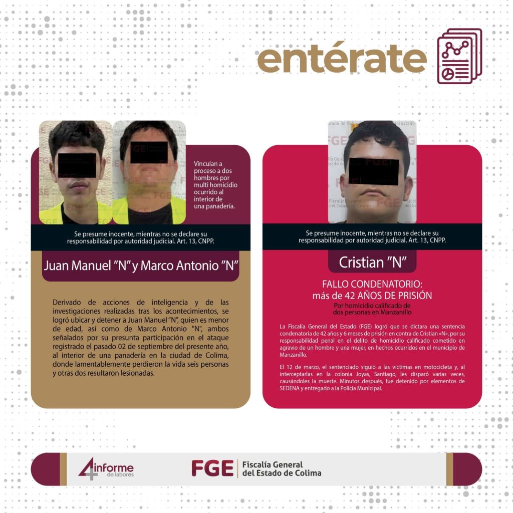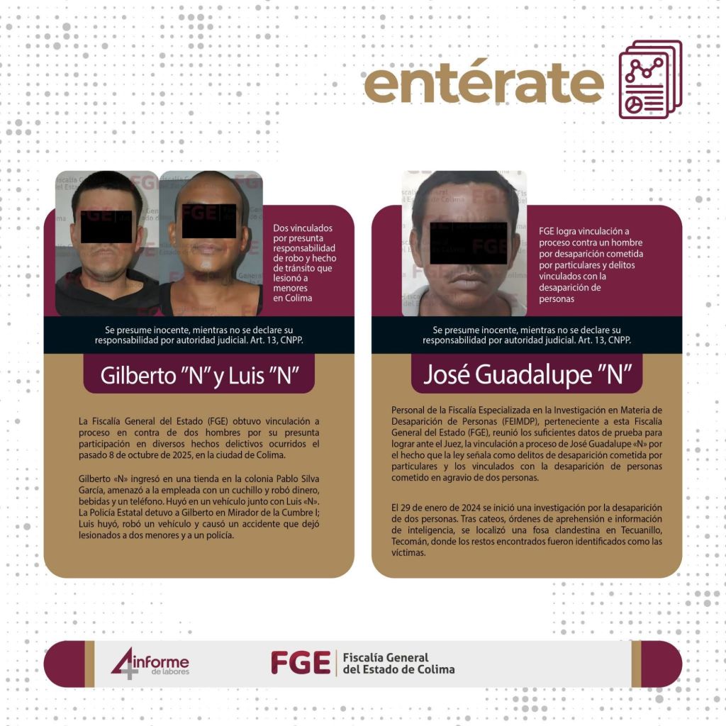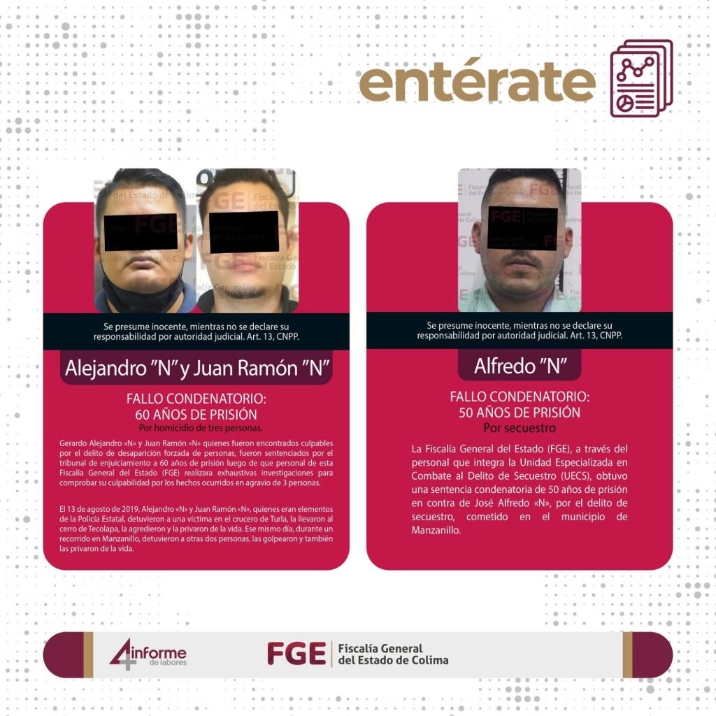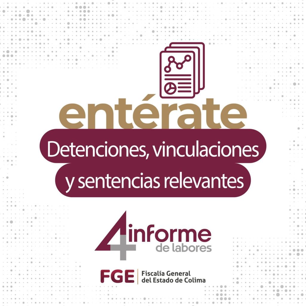 La Fiscalía General del Estado de Colima informa de manera permanente, a través de sus redes sociales oficiales, sobre detenciones, vinculaciones a proceso y sentencias de personas que transgreden la ley.